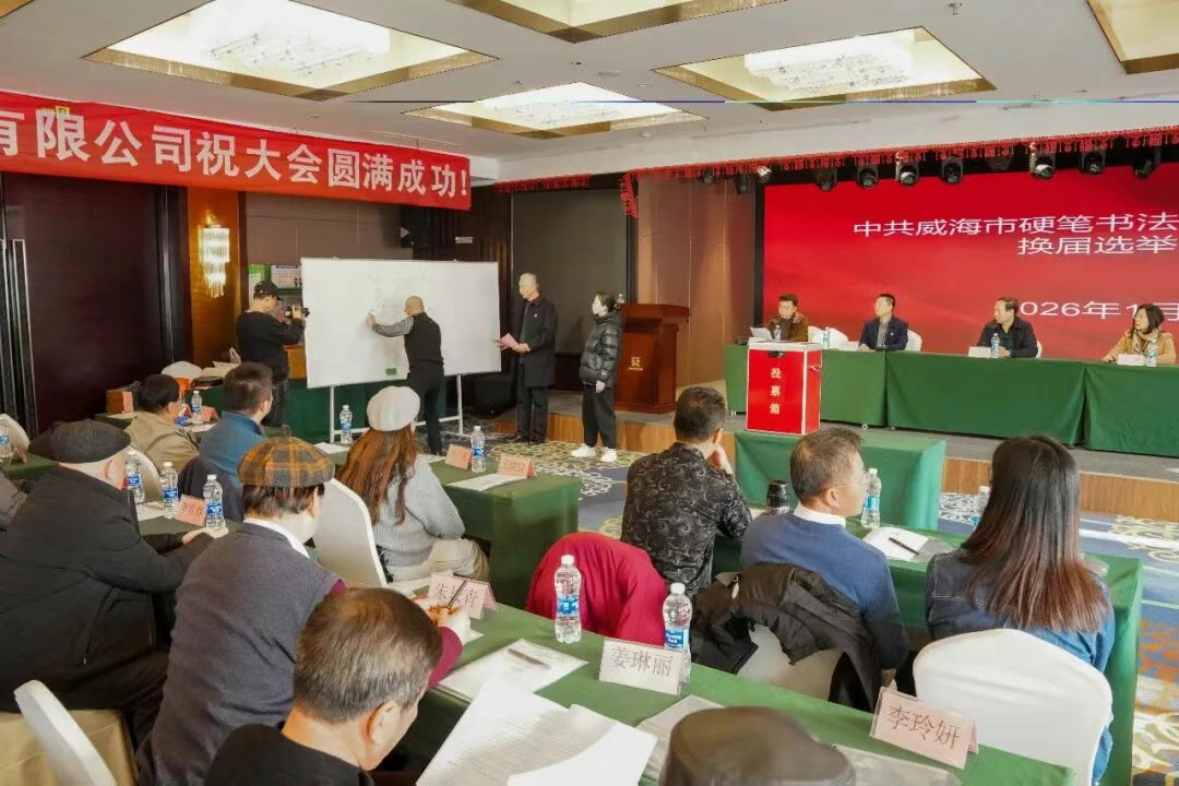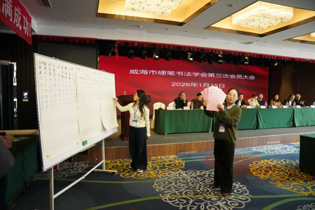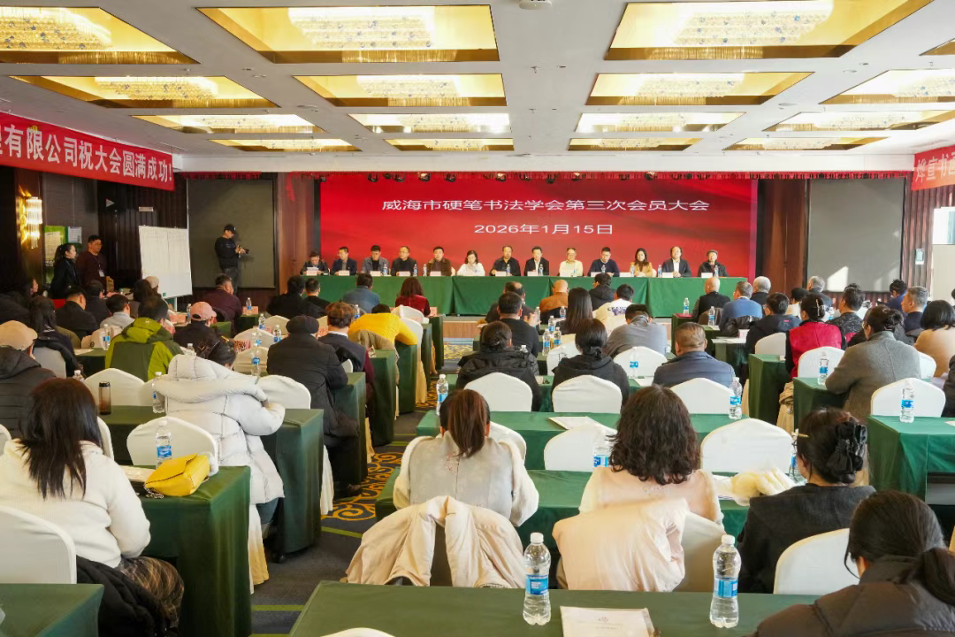 2026年1月15日,威海市硬笔书法学会第三次会员大会在威海天和美术馆成功召开。中国硬笔书法协会党支部副书记、秘书长梁秀,山东大学(威海)原党委副书记刘玉殿,市文联、市民政局、市行政审批服务局等部门相关负责人以及来自全市的128名市级会员参加了会议。